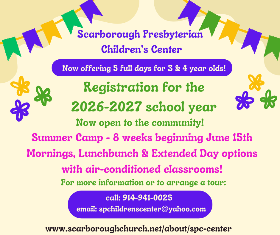 Scarborough Presbyterian Children’s Center is a developmental pre-school. We are fully licensed by the New York State Office of Children and Family Services. It is our belief that children grow and learn when they are free to observe, explore, and actively engage in activities at their own developmental levels and pace. We recognize that children learn through play. Our program provides a warm nurturing environment in which children can thrive. Each child is treated as an individual, respecting their needs, learning styles and personalities. Our child oriented environment addresses the intellectual, emotional, social, and physical needs of young children. We encourage children’s natural curiosity and foster a healthy respect for themselves, for others and for their surroundings. The teaching staff carefully plans for a variety of activities and learning experiences that reflect children’s particular interests and needs. The “learning areas” in the classrooms focus upon sand and water exploration, language arts, cooking, art media, music, block play, dramatic play, puzzles and other manipulatives. At SPCC we encourage a close relationship between parents and staff and have an open door policy. Parents are welcome to visit and participate both informally and on special occasions. We look forward to working together with parents to provide the best preschool experience for their children.